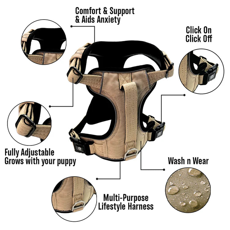 Het tuigje is volledig verstelbaar en past zich aan alle lichaamstypes en -maten van honden aan, waardoor het ideaal is voor opgroeiende puppy's. De veelzijdige kleur past goed bij elke vachtkleur, zodat stijl niet ten koste gaat van functionaliteit.