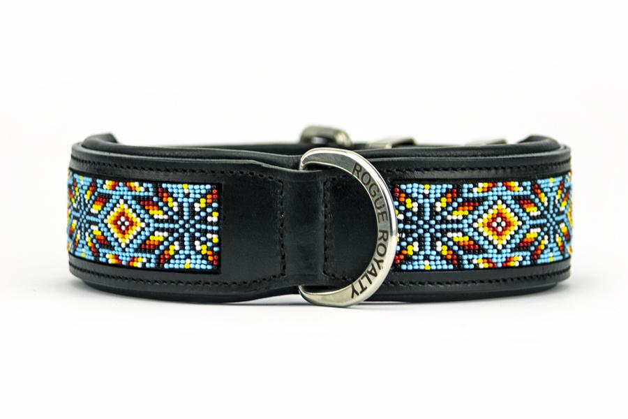 Bold, colourful this handmade leather dog collar is unique, stunning piece with timeless classic looks.Our leather and beading workmanship is amongst its best with these pieces and each collar is a unique masterpiece.