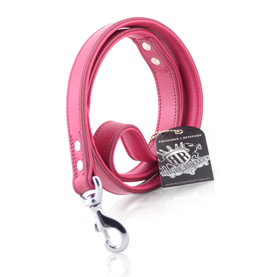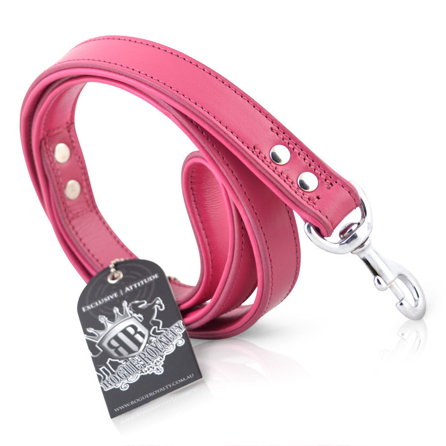 Bijpassende roze lederen hondenlijn die prima bij de roze halsbanden past.