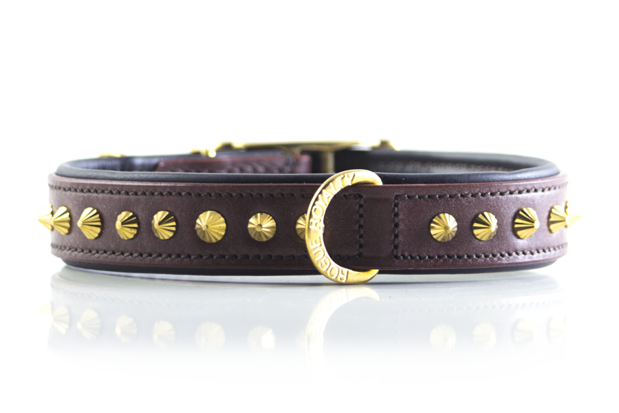 Bold yet understated, and now with a slimmer band for elegance, the Ruthless Brown & Brass Slimfit collar blends sophistication with the style of the Original Iced Out. With this design, your dog is sure to be the best dressed in town! Apart from great looks, our Iced Out range is leather workmanship at its very best, with each cone stud individually diamond cut and every collar stitched with care.